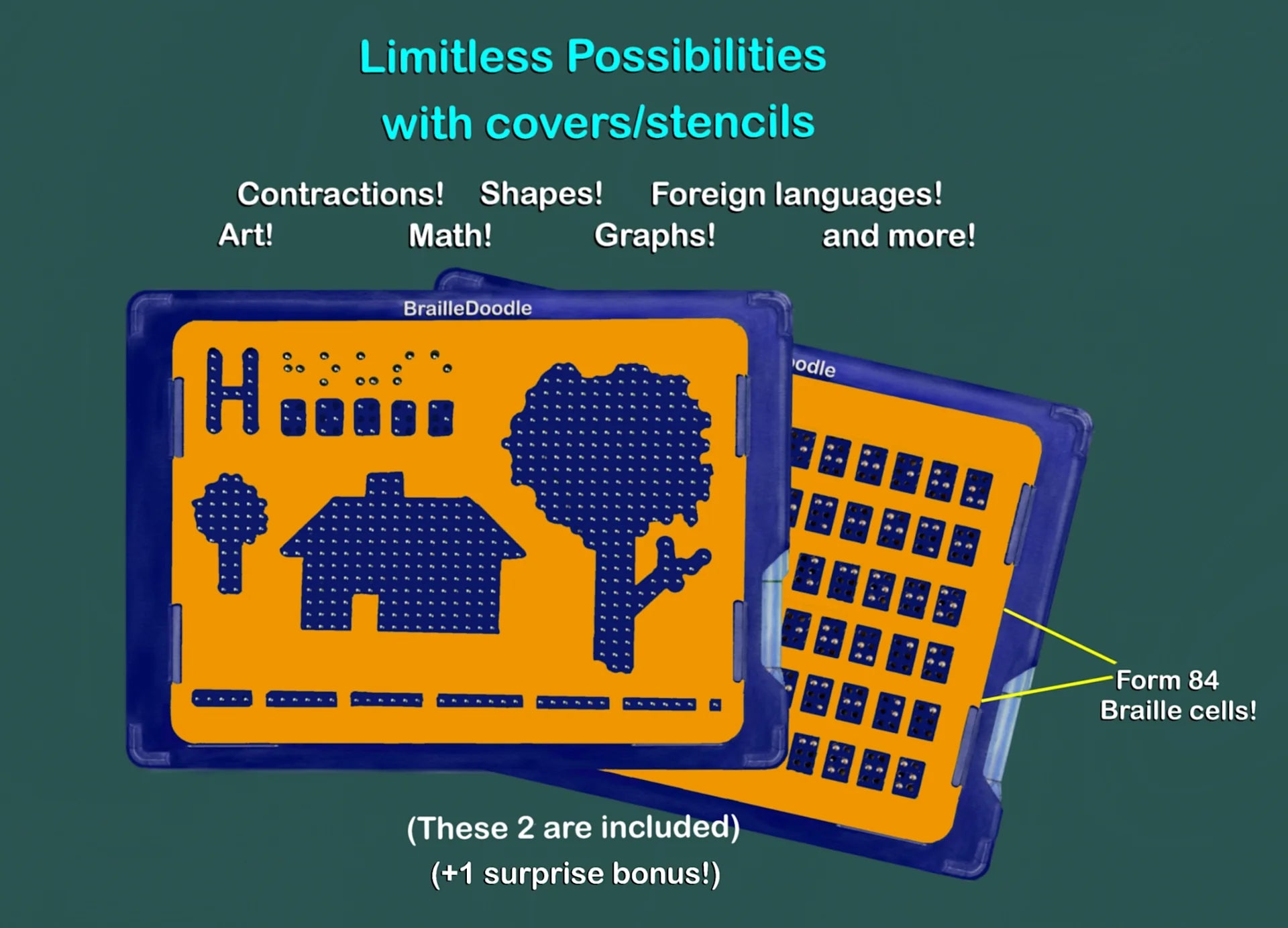 On the flip side, the Doodle surface is a blank canvas with 43x31 holes, (1,333 dots) perfect for creating custom tactile graphics. Whether drawing diagrams, teaching math or science, or creating art, the possibilities are endless. The BrailleDoodle includes two pre-designed stencils: one for crafting an "H" and drawing a house with trees, and another that overlays 84 Braille cells. An additional bonus stencil is also included! Optional stencil packs can be purchased for learning Math Braille, contractions, print letters, shapes, graphs, artistic designs, and even Braille in other languages.