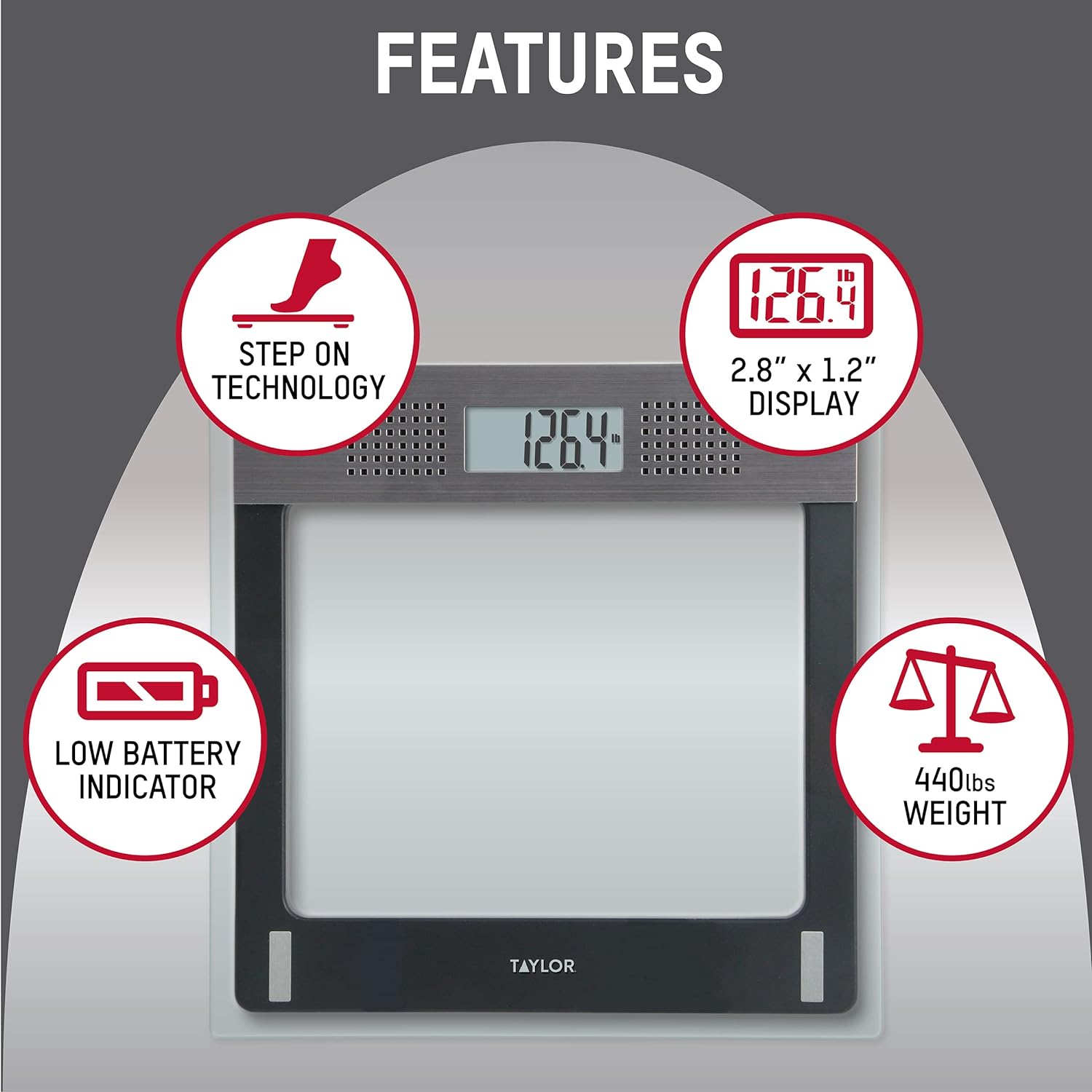 Reach weight goals and measure progress with the functional and stylish Taylor Electronic Glass Talking Scale. Read weight at a glance with the digital talking scale's 1.1-inch LCD display or listen to it announced in a female voice.